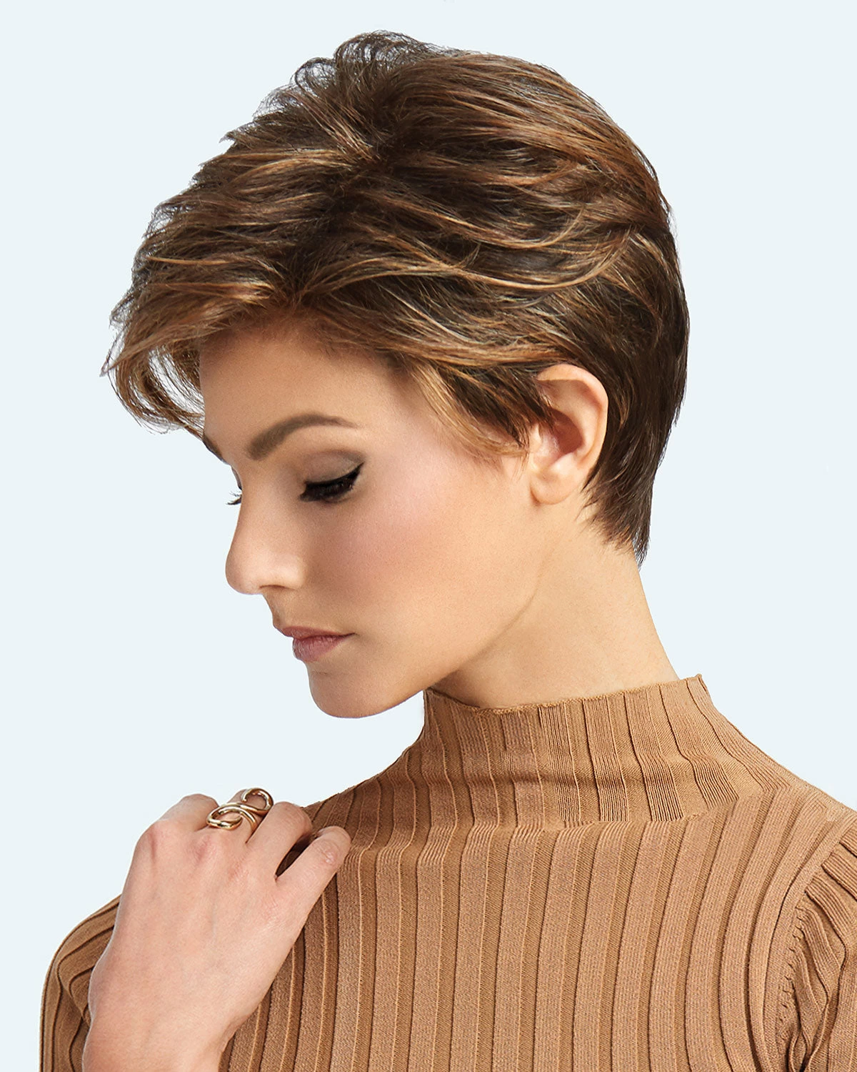 Long layers throughout the top and crown combine with loose textured lengths to create a completely free-formed, windswept look. For added styling excitement, this short silhouette is complimented by a smooth neck hugging nape.