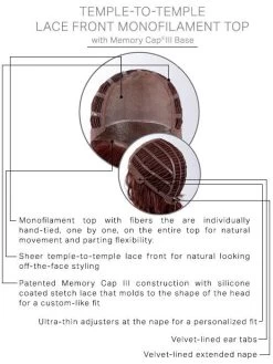 - Sheer Indulgence™ Monofilament Top – Fibers are individually knotted to create the illusion of natural hair growth where the hair is parted and allows you to part the hair in any direction.