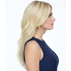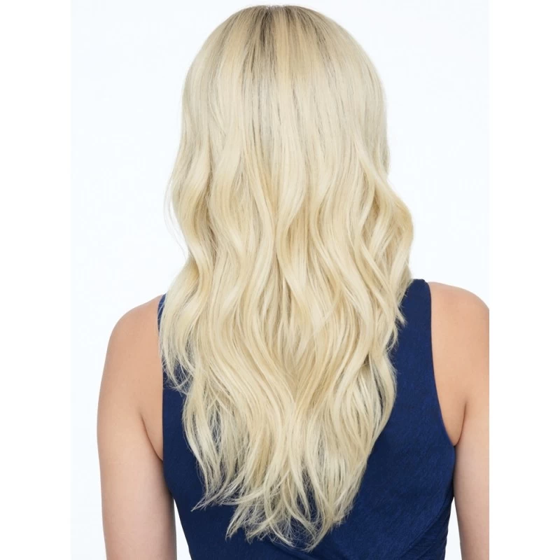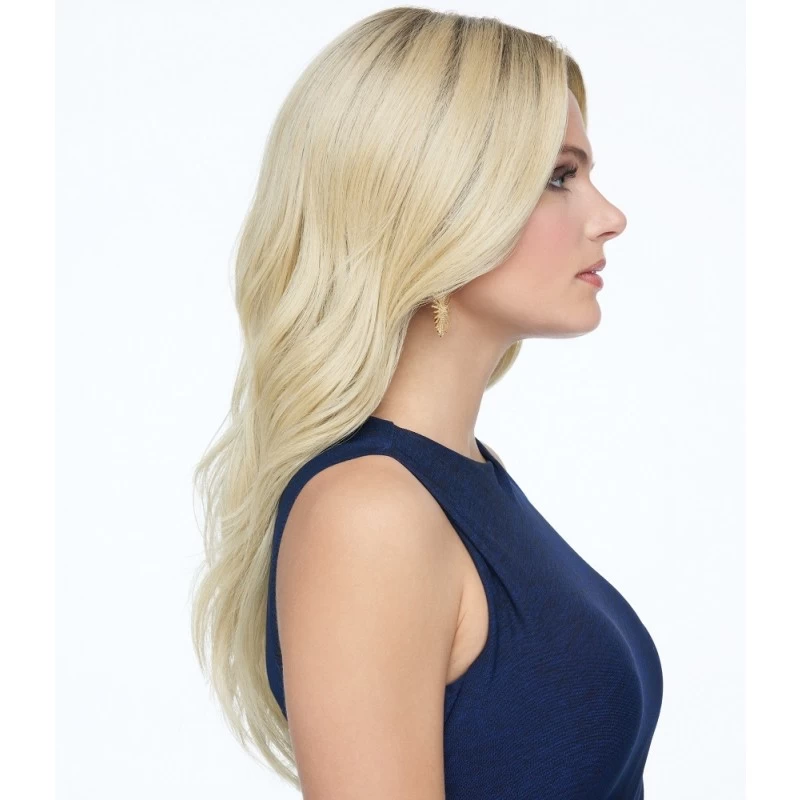 This long and softly tapered silhouette reflects the height of “undone glamour.” Soft waves at the crown and sides become slightly tighter at the ends. The overall effect is a free-formed movement with a modern edge. Long layers throughout give the overall appearance of a one-length cut and keep the style light with just the right amount of body. The lace front monofilament top allows for a multitude of parting options and the 100% hand-tied base offers the ultimate in a light, cool fit.