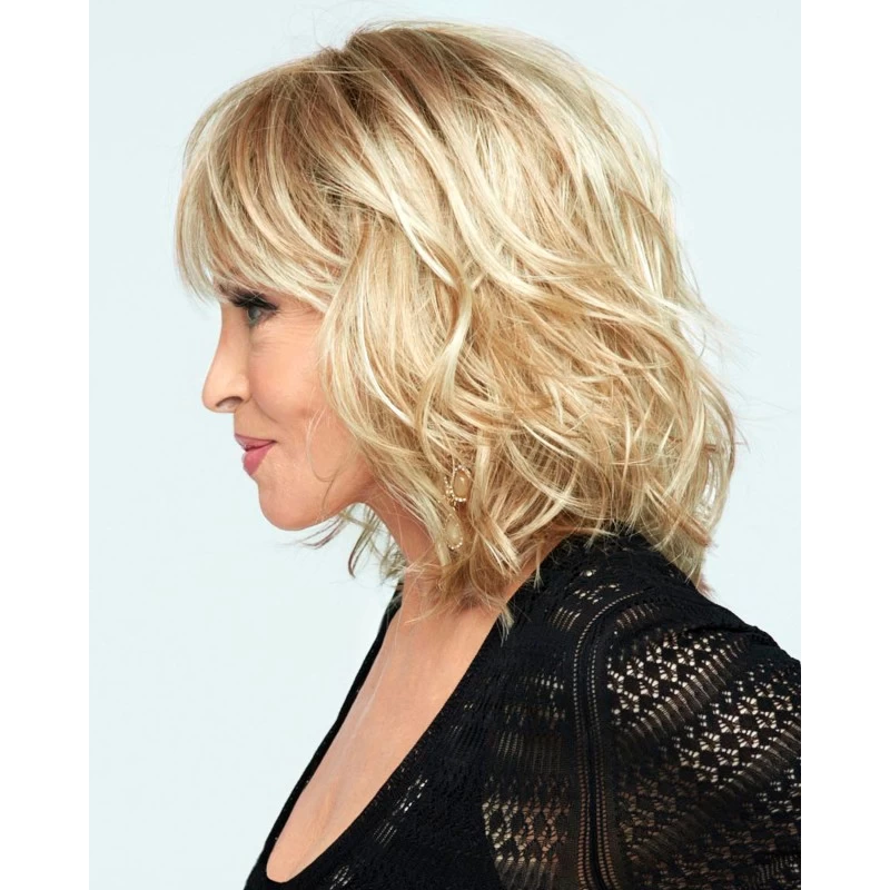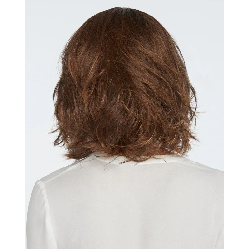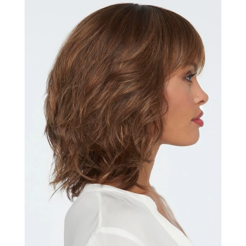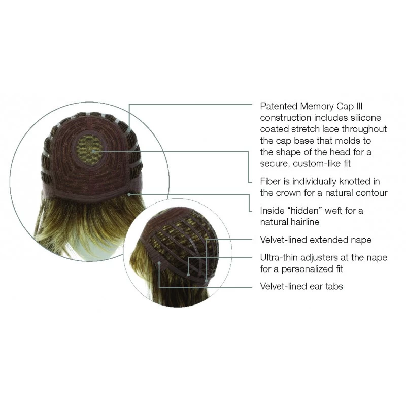 Texture and movement are the inspiration for this blunt, to-the-shoulder bob. A soft, razor cut fringe frames the eyes while tousled and loose curls are layered throughout for natural volume and an unconstructed look. The Sheer Indulgence monofilament crown provides a natural contour. Stop Traffic features the latest cap construction technology by Raquel Welch – the Memory Cap III. The ultimate in light comfort and dependable fit, the makers of this cap took the resilient stretch lace—hallmark of the original Memory Cap design—and coated it with a flexible silicone. This ground-breaking technology yields a superbly comfortable & secure fit while simultaneously maintaining the cap’s shape. It actually molds to the shape of the head for a lighter, cooler, custom-like fit.