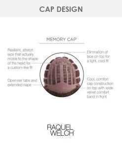Featuring the latest in unique, state-of-the-art wig technology, the Raquel Welch Memory Cap replaces the wide stretch lace used in most of today’s wigs with a thinner, more resilient stretch material that actually molds to the shape of the head for a lighter, more secure fit.